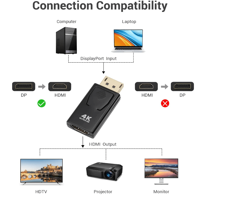 The DP-HDMI adapter offers 4K resolutions up to 3840x2160 at 60Hz; Unlike other DP to HDMI adapter that only support a 1080P refresh rate; this 4K Display Port to HDMI Converter is ideal to get the most out of your new 4K TV.