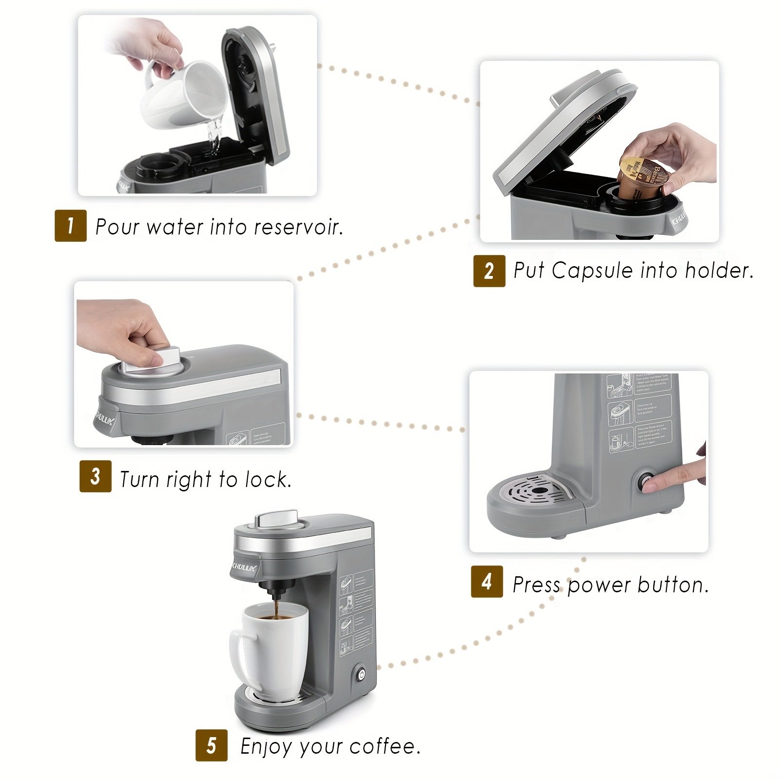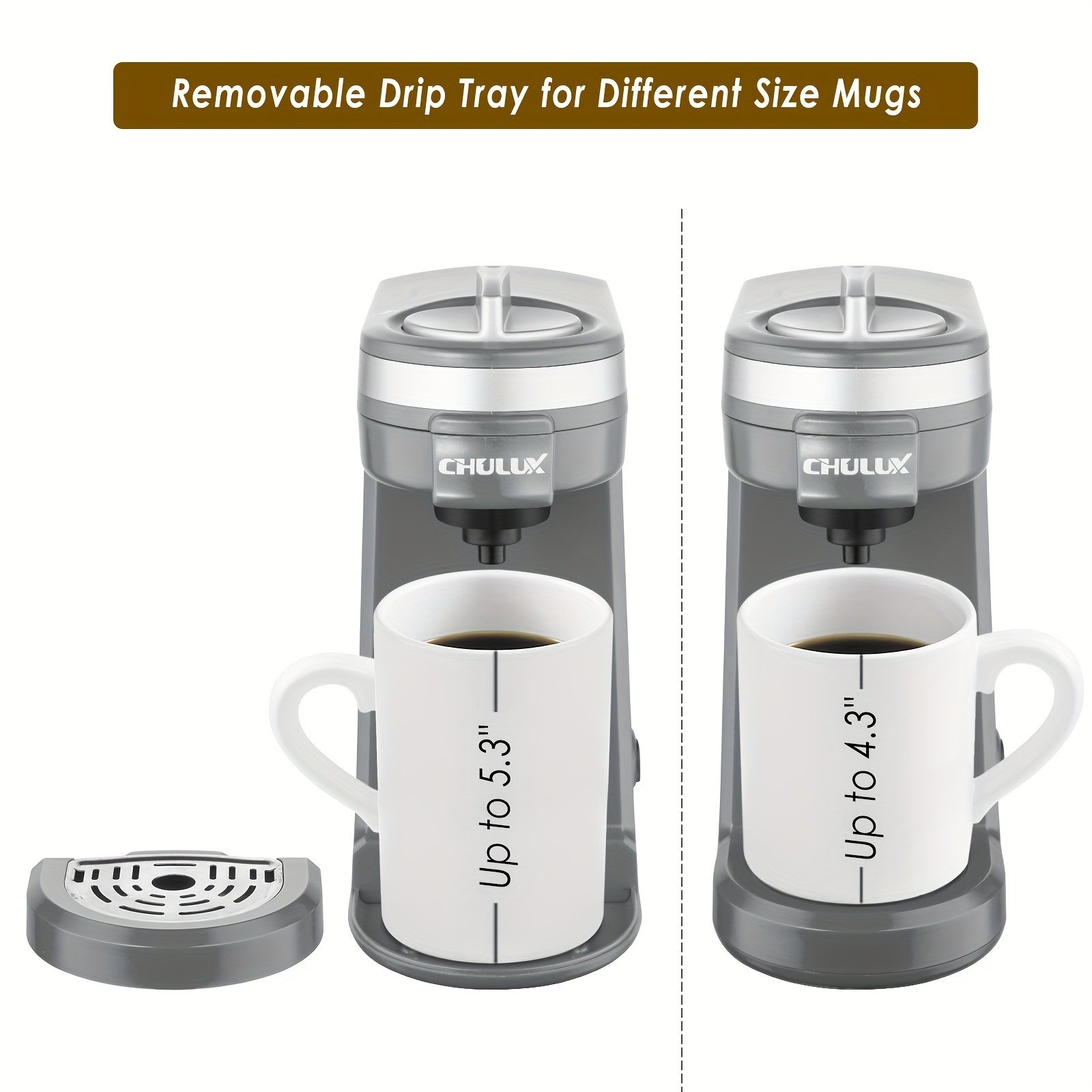 Home > CHULUX Single Serve Coffee Brewer for Pod Capsule with 12 Ounce Built-in Water Tank,800 Watts,Gray