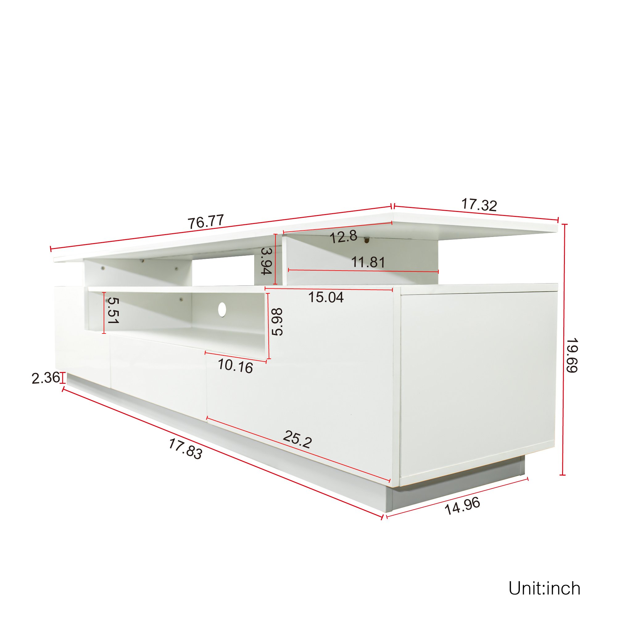 Dimensions: 76.77*17.32*19.69 inNet Weight : 130.07lbsload bearing :110.23lbsDescription:· Modern Style TV Stand: Modern minimalist LED light TV cabinet; 16 kinds of monochrome and 4 kinds of discoloration; high-end luxury; make life more layered. This modern TV stand is very suitable for most home decoration. You can put some vases or other decorations on the top and put it in the living room; bedroom and more places· Large Storage: 76.77" W x 17.32" D x 19.69" H . This under TV is suitable for Up to 80-inch TV. The White TV stand features one drawers and open shelves.Have 2 doors; which provide more area to storage. Plenty of storage space for your entertainment consoles; you can put Xbox; PS4 and even books and magazines in the cabinet that can help you keep your home tidy and clean· Adjustable LED system: This LED TV stand with 16-color LED lights and 4 flash effects is ideal for home lovers. LED lights system with the switch ON/OFF. You can choose your favorite color; which makes your home elegant and beautiful. Great for the study; bedroom; living room; office etc; and suitable for most TVs; such as LCD; Flat; 3D; LED TVs etc· Sturdy and Solid Material: It uses high-density and environmentally friendly E laminated MDF ; high-quality hardware; fine workmanship and durability. All sides in the same color and finished in White ; easy to clean. Ready to assemble with easy to follow instruction manual and Install video· Widely Used: Our television stand is suitable for your lounge room; living room; bedroom and more places. This White TV stand for flat screens fits in well with most home decors; it is ideal for use in living rooms to hold TV and some decorations such as vases and photos at the tops. It is also a housewarming gift for friends and family