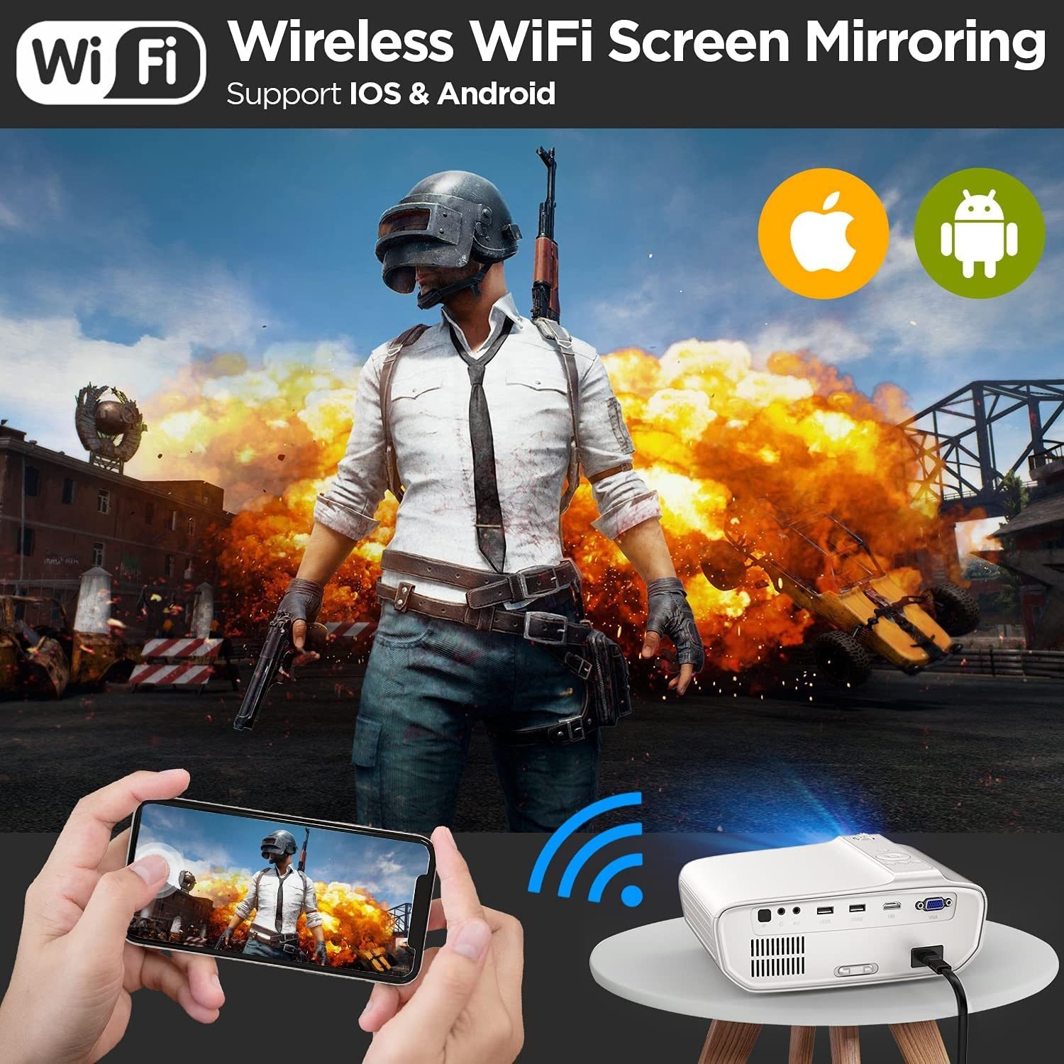 [Wi-Fi Wireless Screen Mirroring for Smartphone]Portable WiFi projector with the latest WiFi connection compatible with the Android Phone /iPhone/iPad/Tablet. No need for expensive HDMI adapters longer, instantly stream Youtube, movies, music, games, and photos on your projector screen. No WiFi environment? This phone projector has already been thought about it, you can connect the projector to your iPhone with your original USB phone charge cable or cellular data easily.