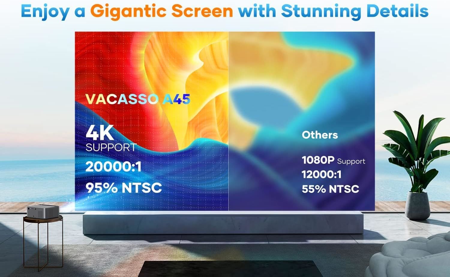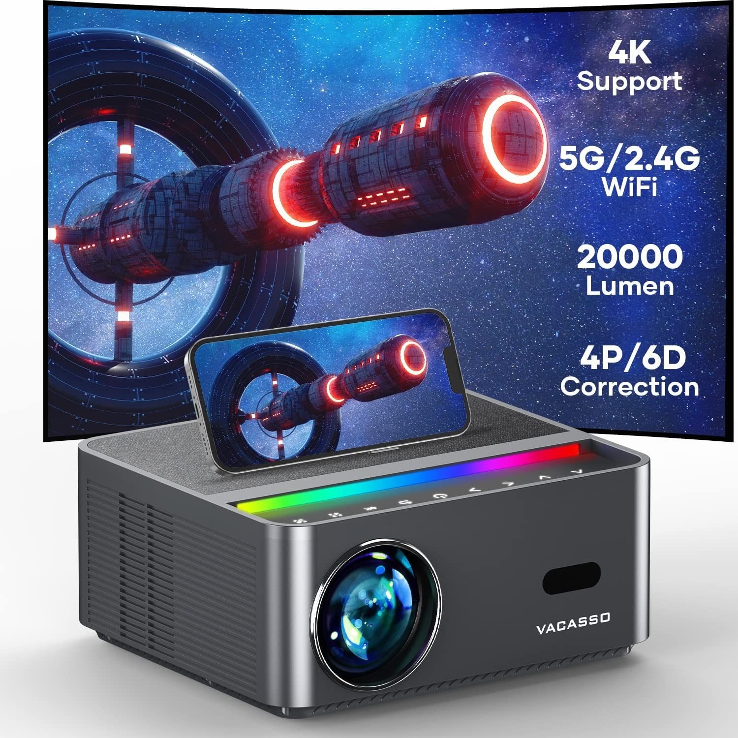 Home > Projector with WiFi and Bluetooth, Portable Projector 4K Support, 500 ANSI 20000L, Touch Screen, Auto Vertical Keystone & 4P/6D, VACASSO Outdoor Movie