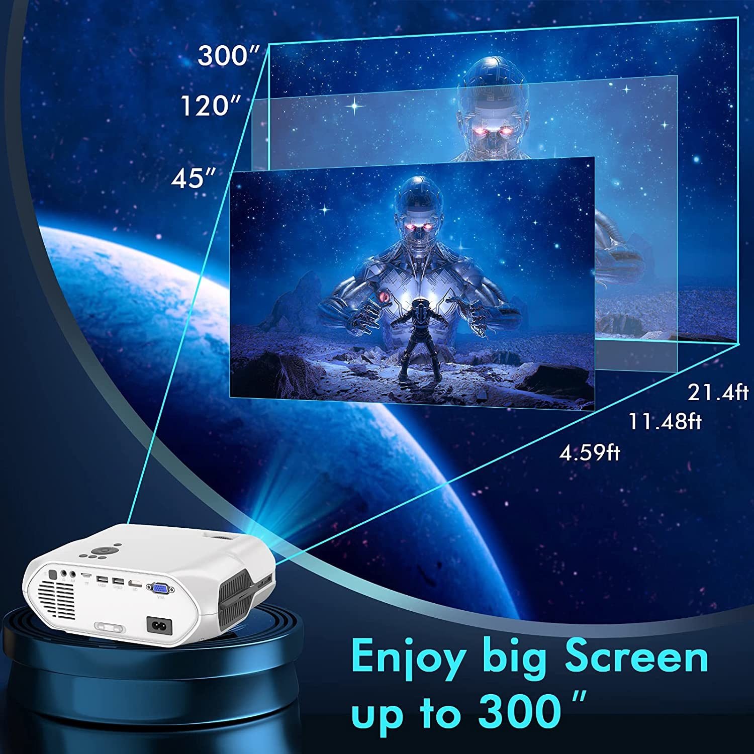 4. Multimedia Connection Versatility & Carrying Cas: The projector provide multiple connection interfaces: a HDMI port, a VGA port, 2*USB port, a AV port and the 3.5mm headphone jack. All these enable the mini projector easily to connect to TV box, Amazon Fire TV Stick, Chrome-cast, PC, laptop, tablet, external speakers, X box, DVD player and U disk. Portable carrying bag, remote control, HDMI, AV cables, power cable, and a lens cover are included