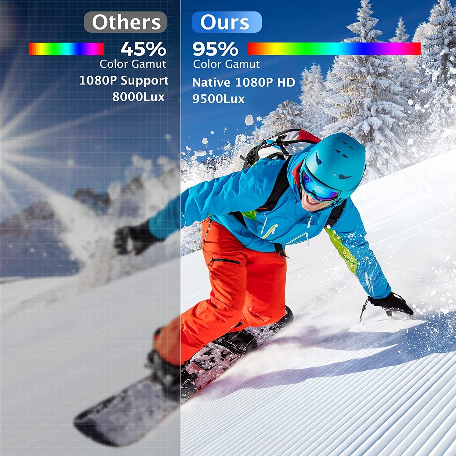 1. Native 1080P resolution:With true 1920 x 1080 resolution, this native 1080P projector delivers a large, bright screen with outstanding image clarity and color accuracy for a more realistic viewing experience. The dynamic contrast ratio of 10000:1 provides high contrast, clear shadow details, and deep black levels, adding depth and three-dimensionality to the picture.